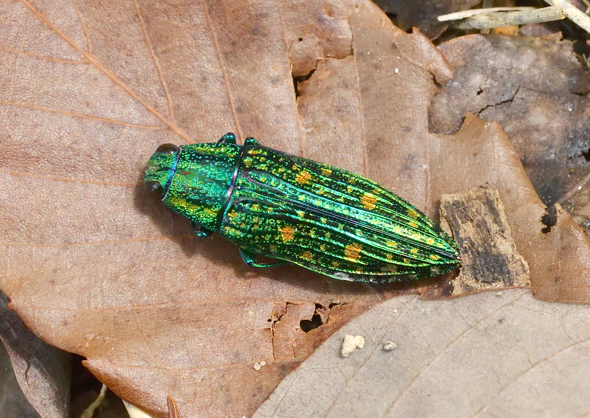 甲虫目 カブトムシ亜目 タマムシ上科 タマムシ科 ルリタマムシ亜科 撮影地:宝塚市北西部 枯れ葉の上にあった死骸。この色のものは、かなり少数と思う。 持ち帰り、標本にした。
