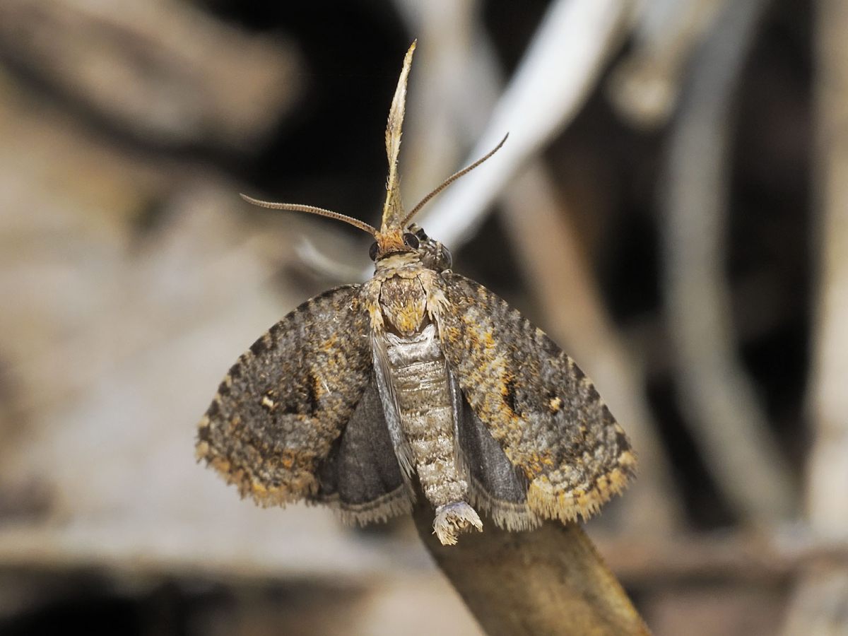 *口元から上に伸びるものが見られるが、これはこの蛾の器官ではなくとまっている枯草の先端である。