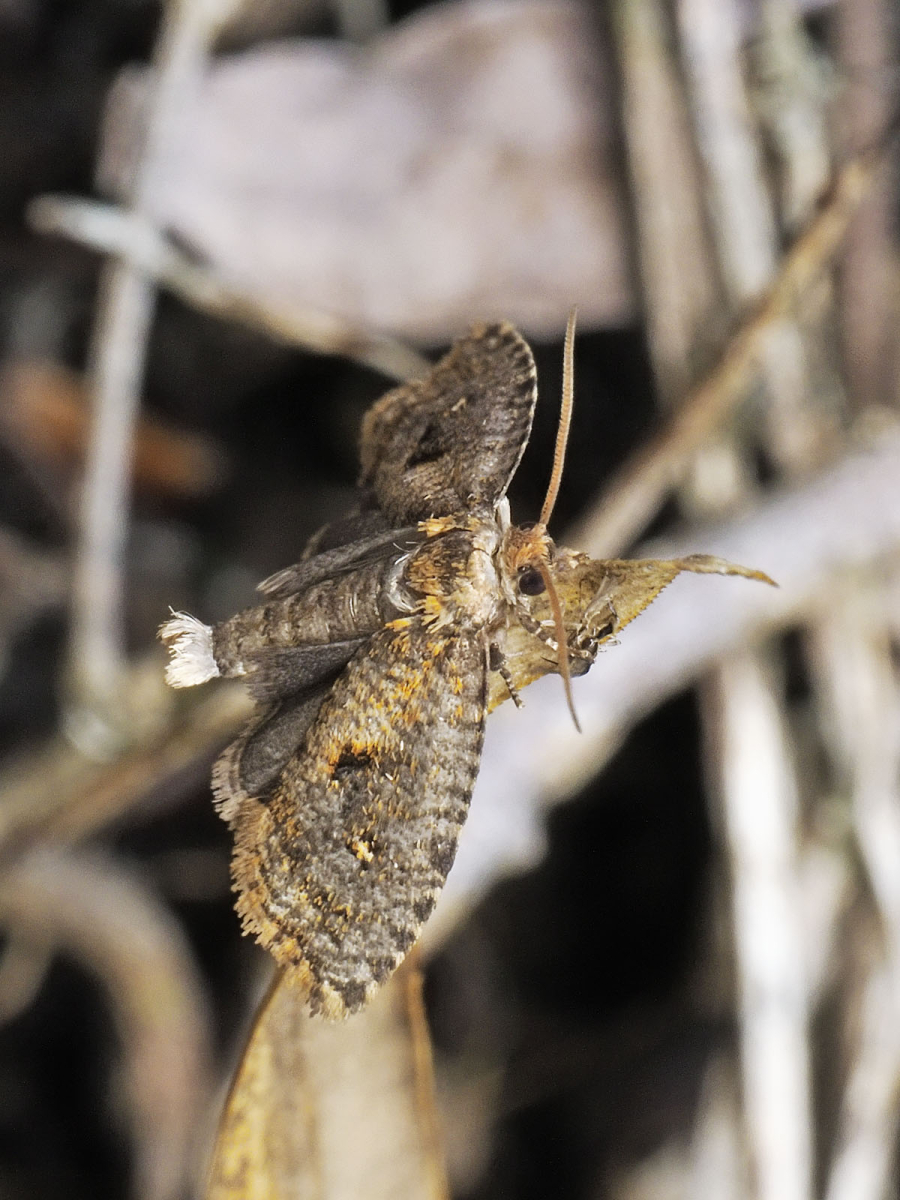 尾部に白い毛が見える。ヘアペンシルと呼ばれるオスの器官で、これを使ってメスを呼ぶフェロモンを空気中に撒き散らす。 撮影地:西宮市北東部