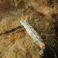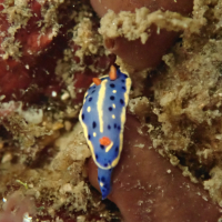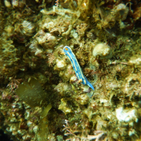 アオウミウシは体が細長く、小型で、青色と白色の鮮やかな模様が特徴です。