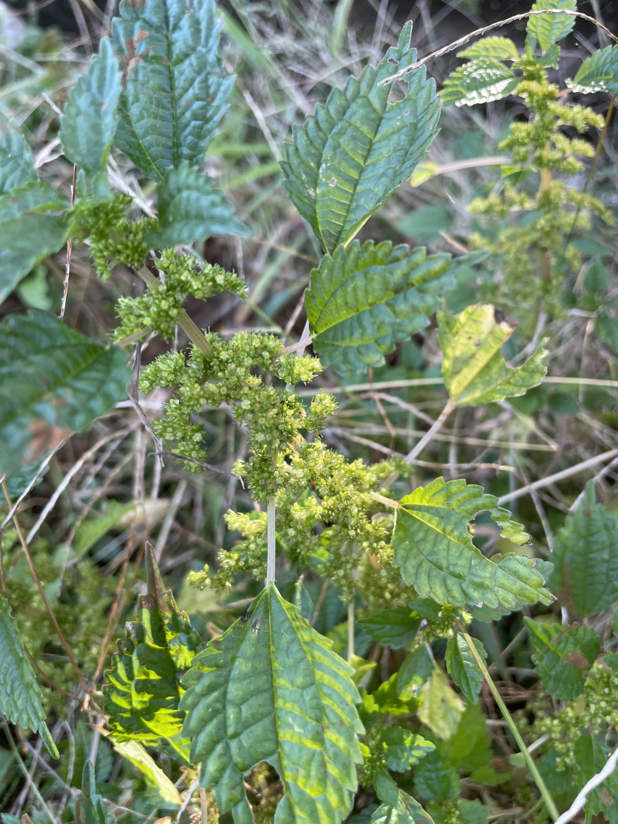 林縁や林内の湿った場所に生える一年草で、高さは30~50cmになる。 日本の北海道~九州と、朝鮮半島、中国、台湾、モンゴル、ロシア(シベリア東部)、北アメリカに分布する。 茎は緑色で無毛、多くの水分を含んでおり透明感があって瑞々しい。 葉は、葉とほぼ同長の葉柄がついて対生し、葉身は長さ3~10 cmの菱状卵形で3本の葉脈が通り、葉の先端は尾状にとがり、基部は広いくさび形になる。葉縁には三角形の大きな鋸歯が5~10対ある。托葉があり、小型で長さ1~2mm。 雌雄同株で雄花と雌花があり、花は7月~10月に咲く。葉腋から左右1対の雄花と雌花が混生した長さ1~3 cmの集散花序をだす。雄花には淡紅色を帯びた花被片と雄しべが2~4個で、葯は白色。雌花は緑色で花被片が3個ある。 山菜として食用にされ、皮をむいた茎をおひたしや和え物に利用する。