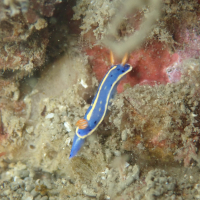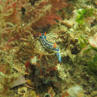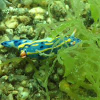 アオウミウシは体が細長く、小型で、青色と白色の鮮やかな模様が特徴です。