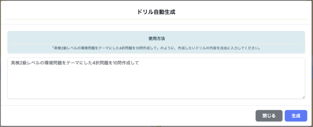 - 詳細はこちら→ヘルプ:生成系AIを利用したドリル自動生成