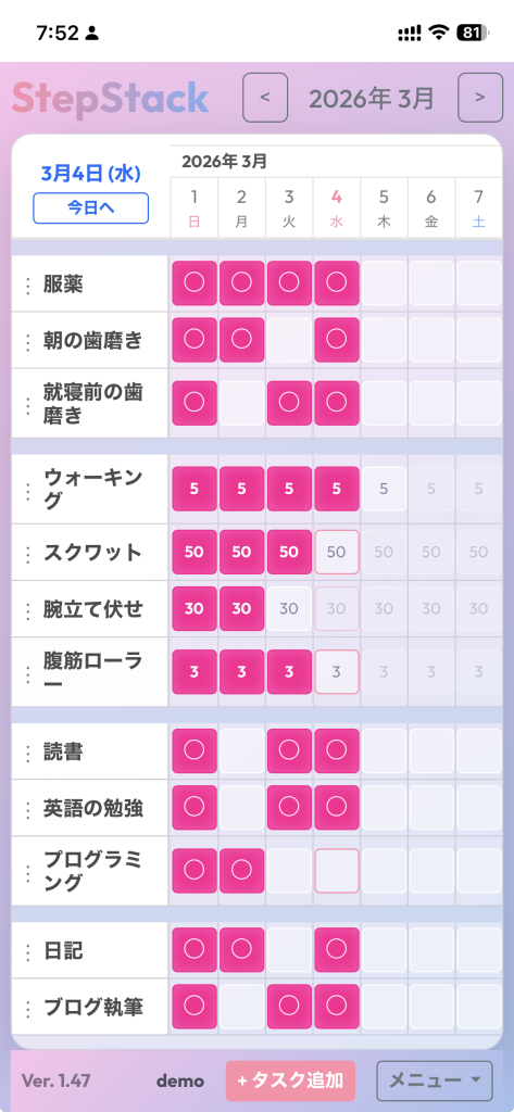 StepStack(ステップスタック)は、毎日コツコツと積み重ねた努力や実績を視覚化し、日々の継続をモチベーションに変えるためのウェブベースのタスク管理・習慣トラッキングツールです。