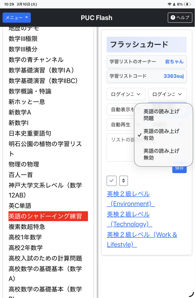 - その際、「英語の読み上げ問題」の項目で、「英語の読み上げ有効」に設定してください。