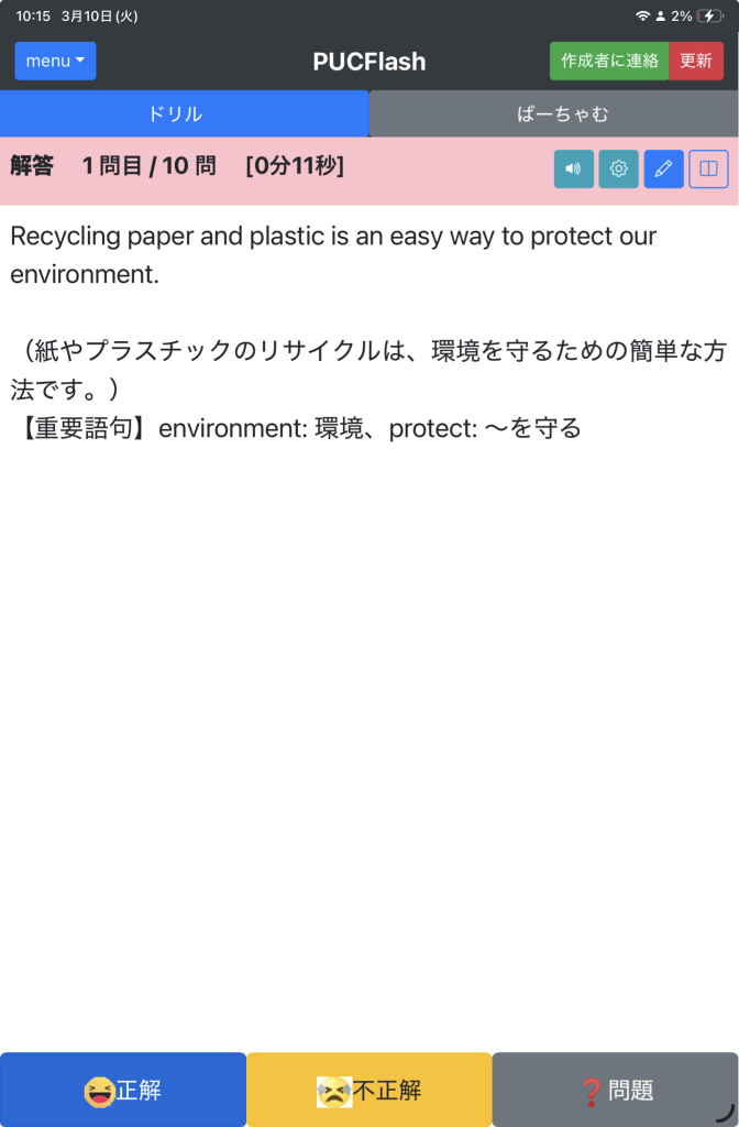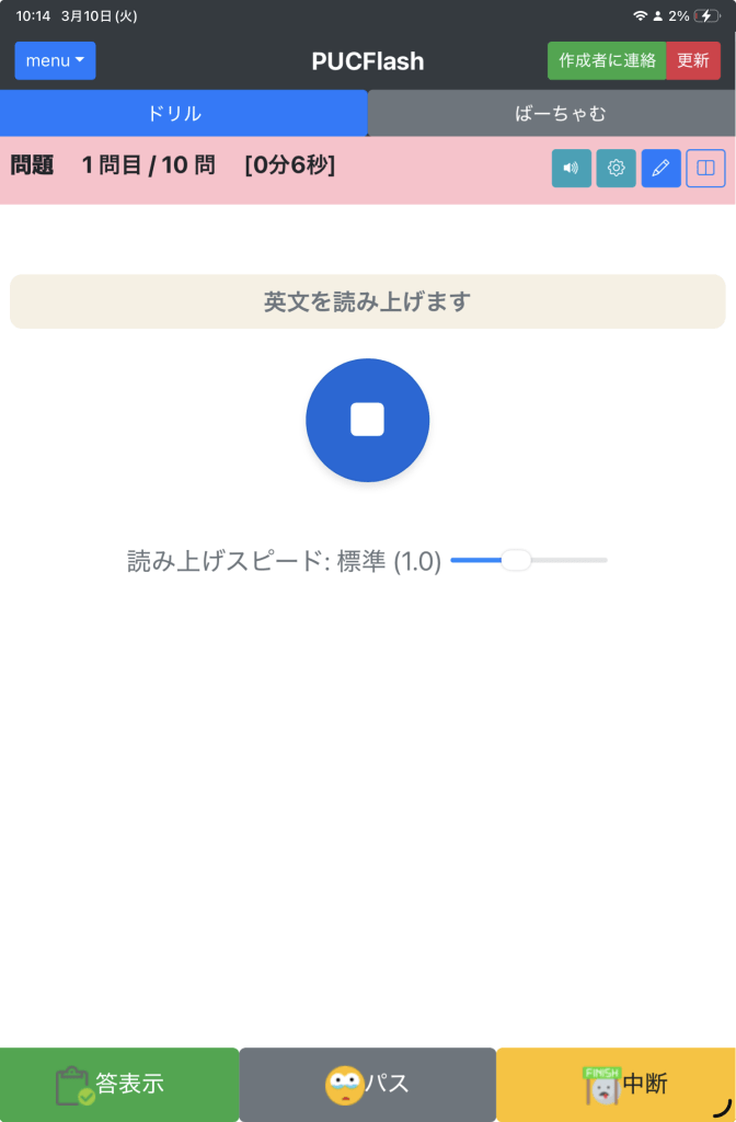 - 問題を開くと、左のようなUIが表示され、英文が読み上げられます。